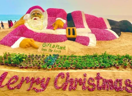 Construyen la escultura de Papá Noel más grande del mundo con cebollas y arena