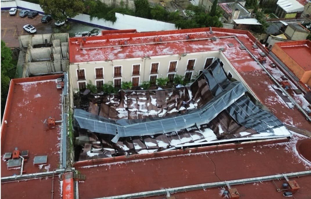 Una de las eventualidades más graves ocurrió en el centro histórico de la ciudad de Tlaxcala, donde el techo de un hotel colapsó.