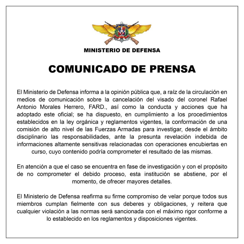 Panorama Nacional. -El Ministerio de Defensa informó, a través de un comunicado oficial, que ha conformado una comisión de alto nivel de las Fuerzas Armadas para investigar, en el ámbito disciplinario, al coronel Rafael Antonio Morales Herrero, FARD, tras la cancelación de su visado y la circulación de informaciones en medios sobre su conducta y acciones.