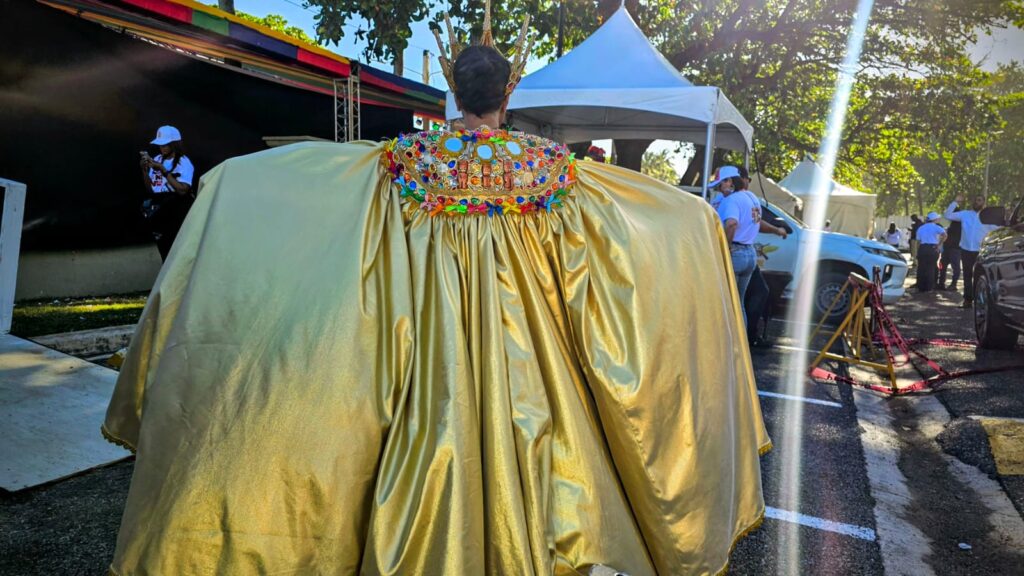 La comunicadora detalló que la capa del traje incluía figuras inspiradas en elementos indígenas, como parte de la dedicatoria al grupo carnavalesco conocido como Los Taimácaros, representativo de la tradición cultural puertoplateña.