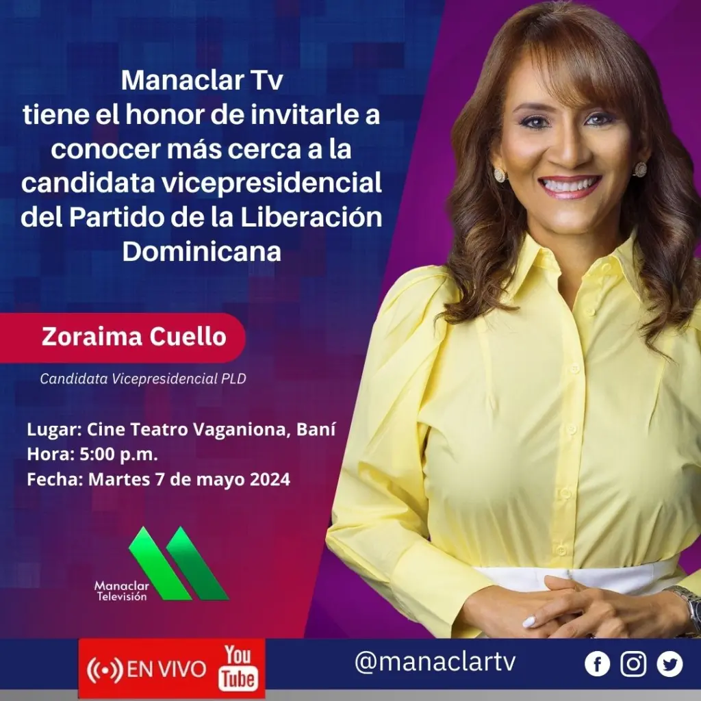 Panorama Nacional.- El próximo martes 7 de mayo de 2024, Manaclar TV y la comunicadora Raiza Lara recibirán a Zoraima Cuello, candidata a vicepresidenta por el Partido de la Liberación Dominicana (PLD). La intervención se llevará a cabo en el Cine Teatro Vaganiona en Baní, a partir de las 5:00 p.m.